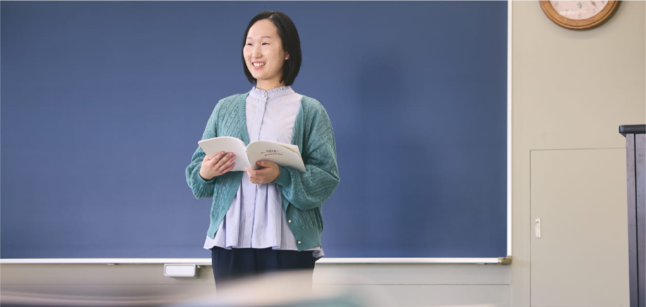 私自身が学校給食が好きだったことをきっかけに、将来は給食を通して子どもを笑顔にする立場になりたいと思い、栄養教諭を志しました。教員免許取得に向けては、一つひとつの授業を大切にすること、試験勉強は計画にすることなど、メリハリをつけることで、4年生まで気持ちを切らさないように心がけました。教育実習では先生方の声かけや授業の工夫によって子どもの反応が変わる場面に多く出会い、食育の大切さを実感しました。また調理実習や研究授業を通して、食への意識が育っていく様子を間近で見ることができ、栄養教諭の仕事にやりがいを感じることができました。将来は安心・安全な給食を基本にしながら、望ましい食習慣を身につけ、健康に過ごすことの大切さを伝えていきたいです。