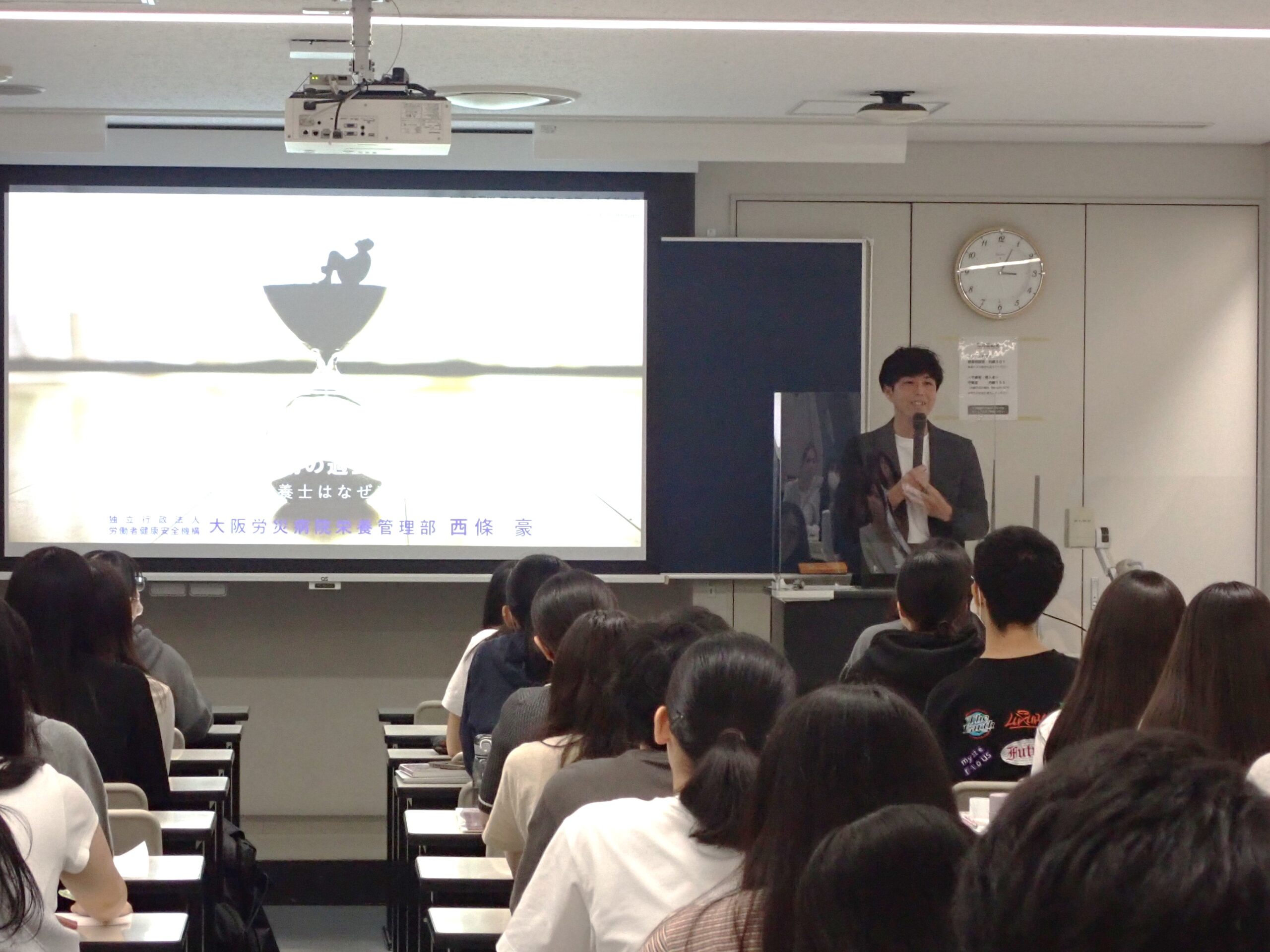 9月26日(金)4限目に、昨年に続き、実習先でもある大阪府堺市にある独立行政法人労働者健康安全機構 大阪ろうさい病院の栄養管理室長 西條 豪先生に、時代のニーズに合わせた病院管理栄養士の業務の変遷と未来への期待について講話をしていただきました。