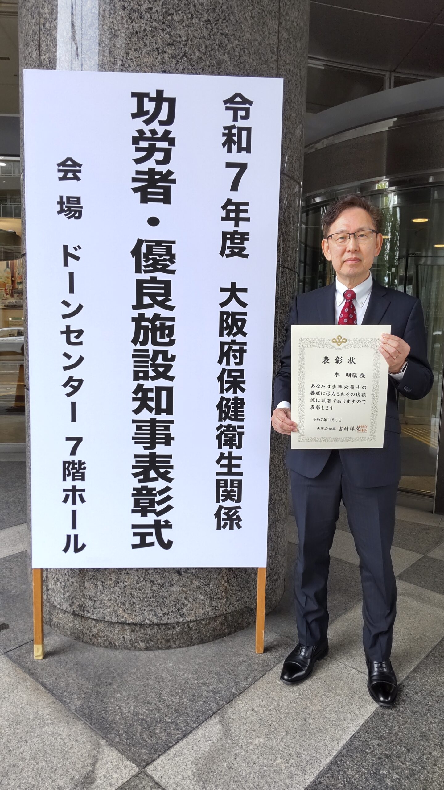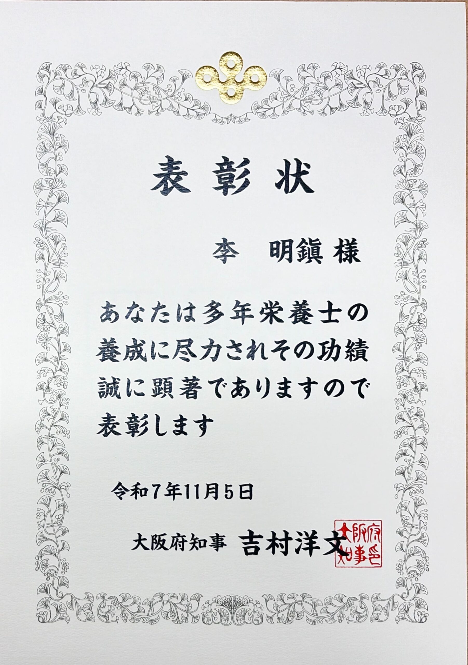 本学 健康栄養学部より、学部長 李 明鎭 教授を推薦したところ、11月5日、「大阪府立男女共同参画センター(ドーンセンター)7階ホール」にて表彰式があり 「栄養士養成功労者」として、渡邉副知事より「令和7年度 大阪府栄養関係功労者表彰」が授与されました。