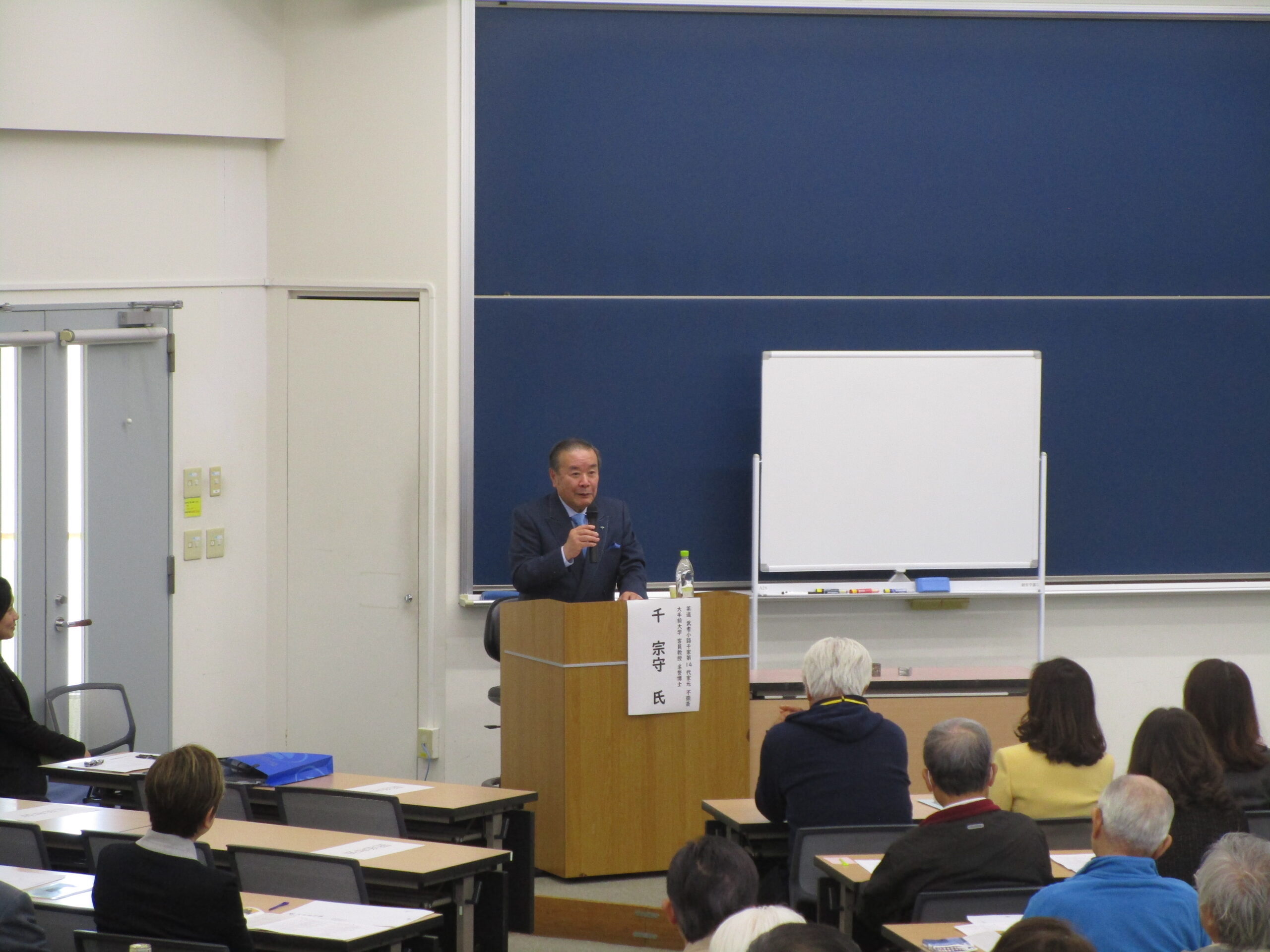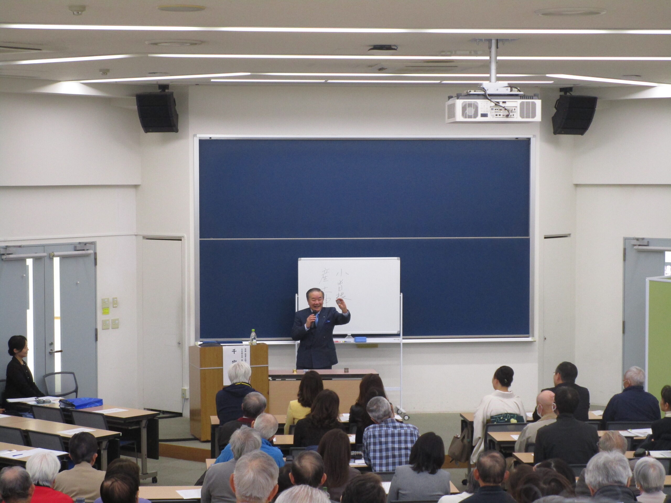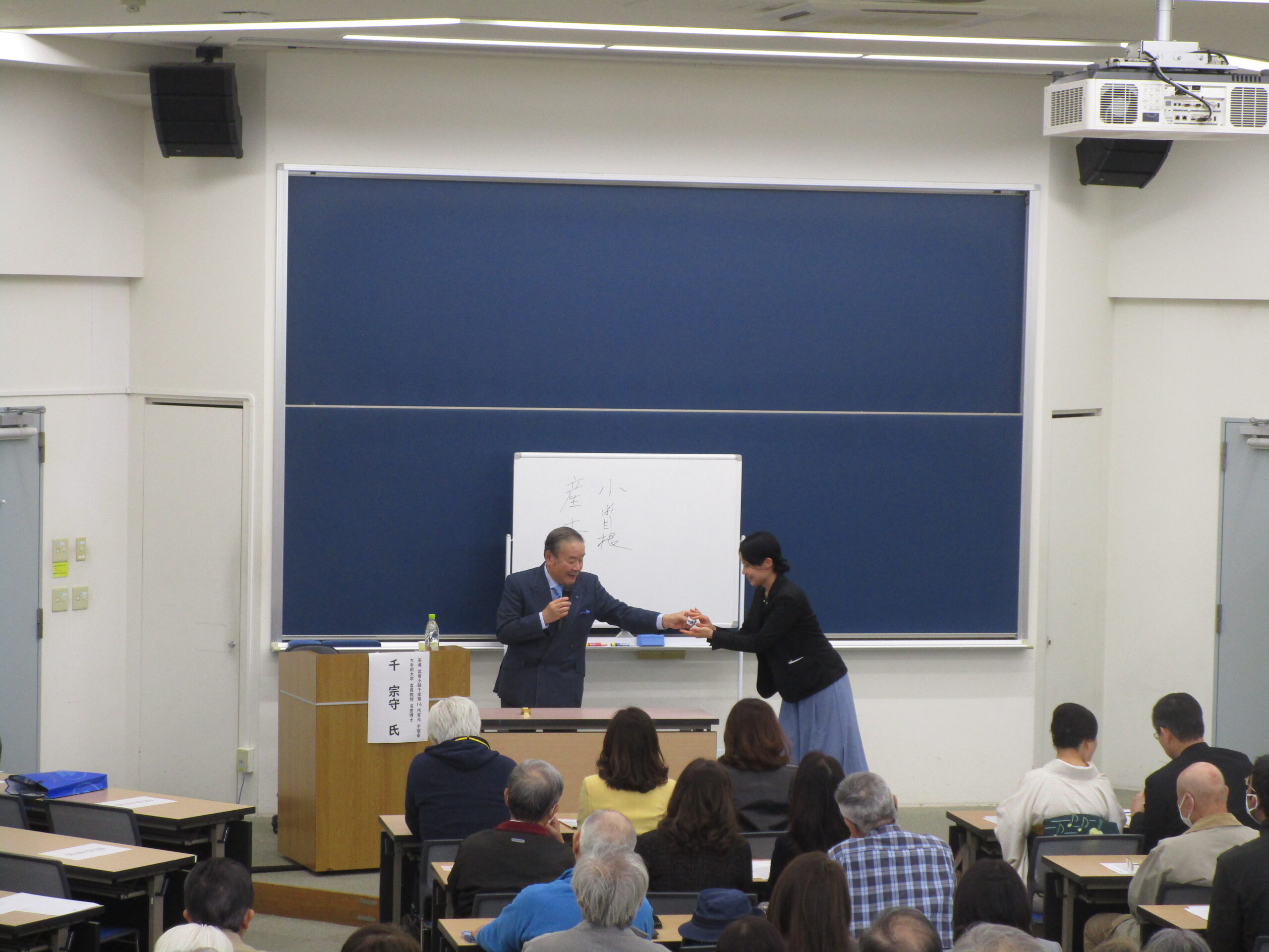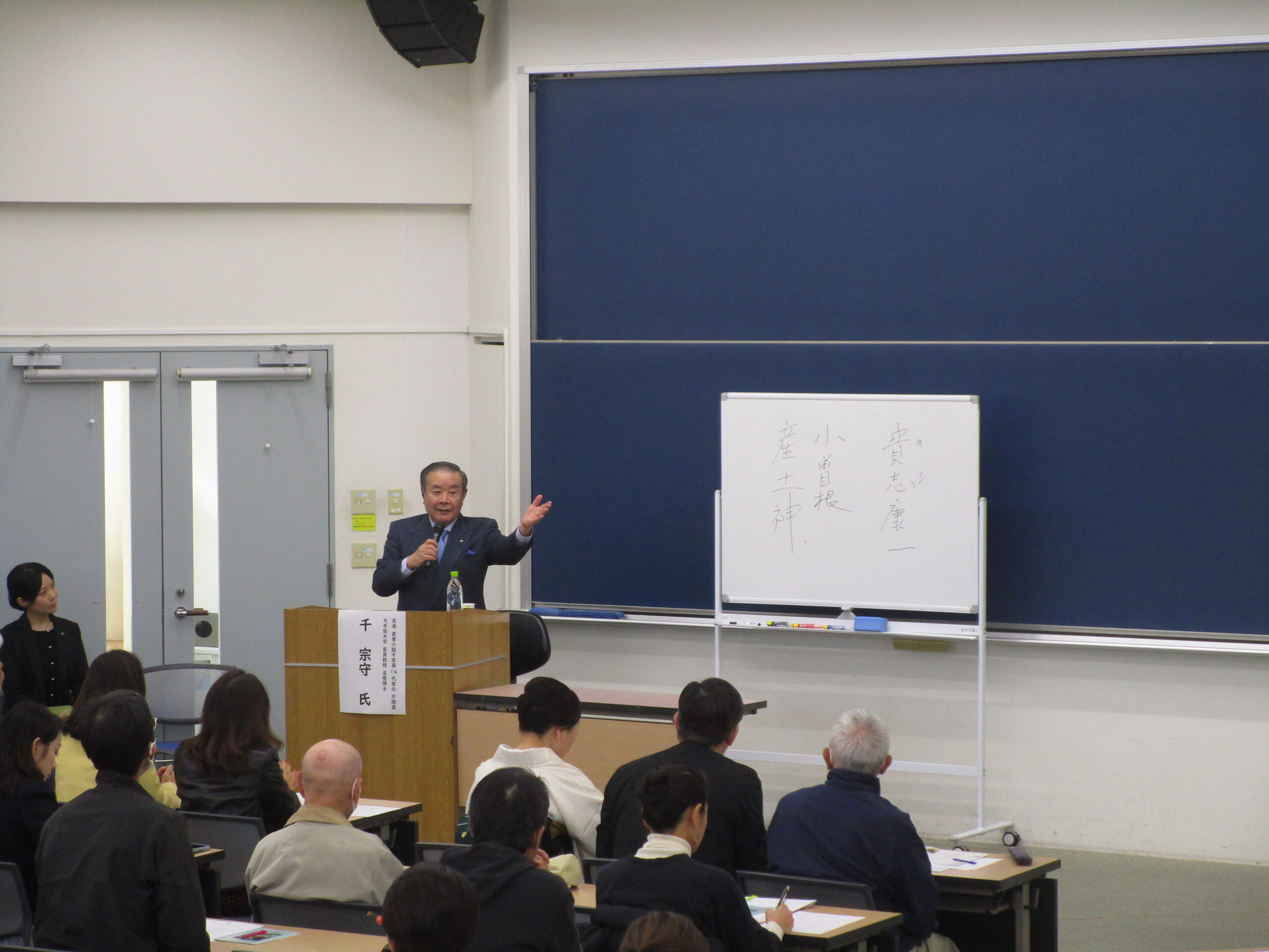 2025年度後期公開講座は「阪神地域の文化・文学・歴史」をメインテーマとして開催します。第3回は、茶道 武者小路千家 第14代家元 不徹斎 大手前大学 客員教授 千宗守氏を講師にお迎えして「和魂洋才」をテーマに、11月8日(土)に開催しました。気持ちの良い秋晴れの空の下、130名を超える皆さまにお集まりいただきました。千宗守先生は2004年4月より大手前大学客員教授を務めていただいており、2006年には大手前大学名誉博士号を受けられるなど、本学とは縁が深いことから、今回公開講座の講師をお引き受けいただいた次第です。