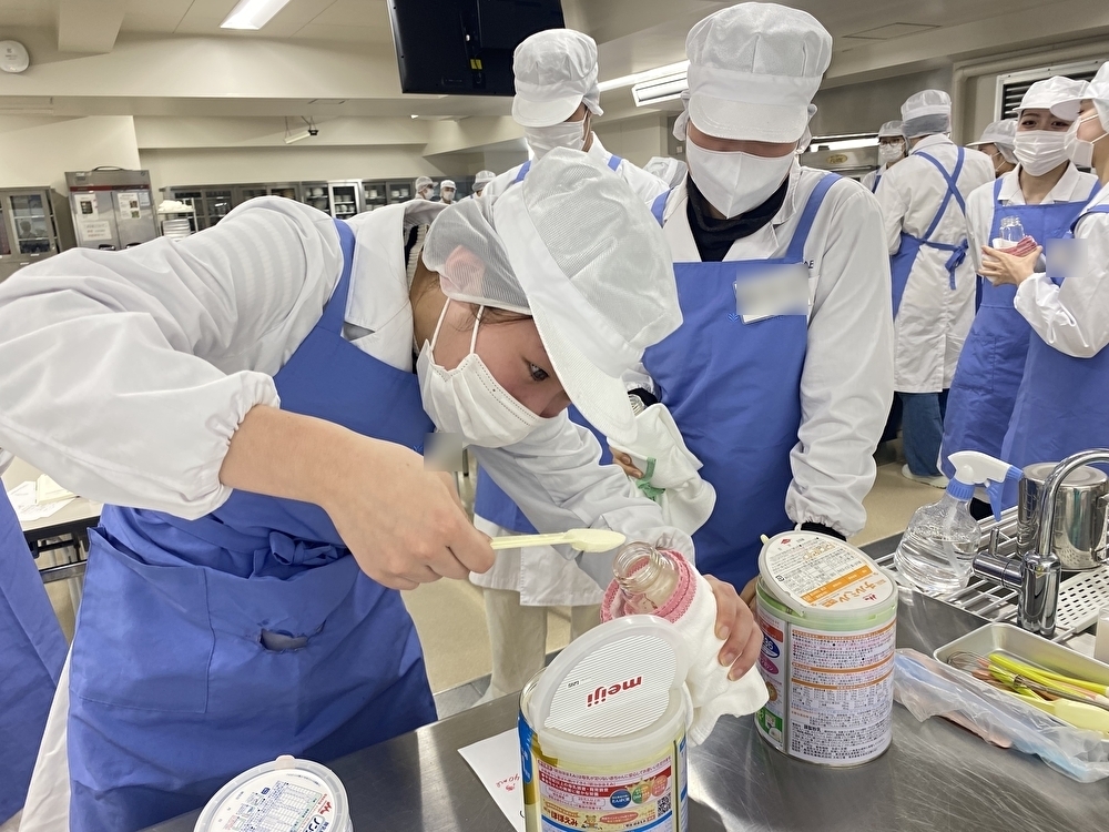 各班で離乳初期(5カ月)・離乳中期(7カ月)・離乳後期(10カ月)の乳児を対象とした離乳食を作成します。市販のベビーフードと手作りの離乳食の違いを食べ比べたり、成長にあった食形態であったかを確認し、自分たちが立てた献立が対象者に適していたのかを確かめます。今回は乳児期の実習のため、離乳食に加え、調乳も行いました。
