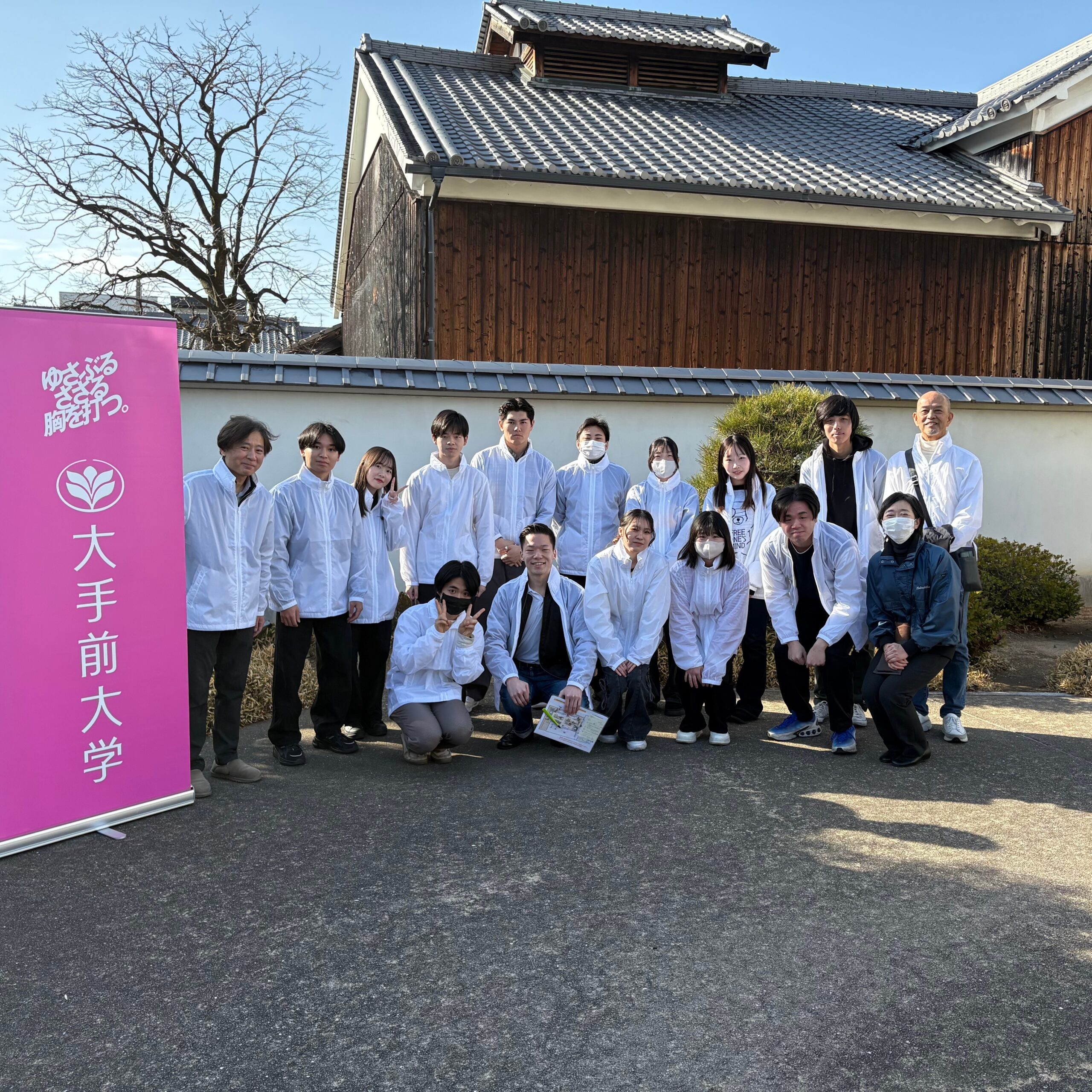 現代社会学部の観光・地域マネジメントのゼミ生(13名)が、2月14日(土)に白鹿記念酒造博物館(西宮市鞍掛町)で開催された「大手前大学生にも『伝統的酒造り』を聞いてみよう」に参加しました。この企画は昨年から2年連続の開催で、学生が手作りのパネル等を使いながら灘の酒造りについてガイドをするというイベントです。