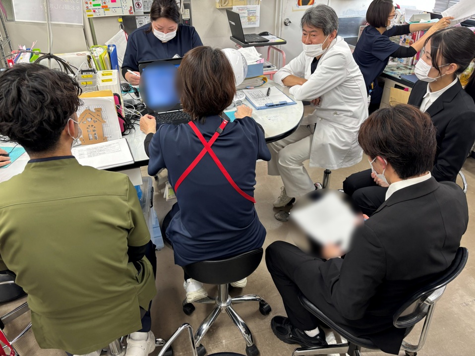 患者様の背景や状態、CT画像や血液データなどの客観的情報をもとに、「なぜこの栄養管理方法が提案されるのか」を一つひとつていねいに説明いただき、学生たちは真剣な表情で見学に臨んでいました。