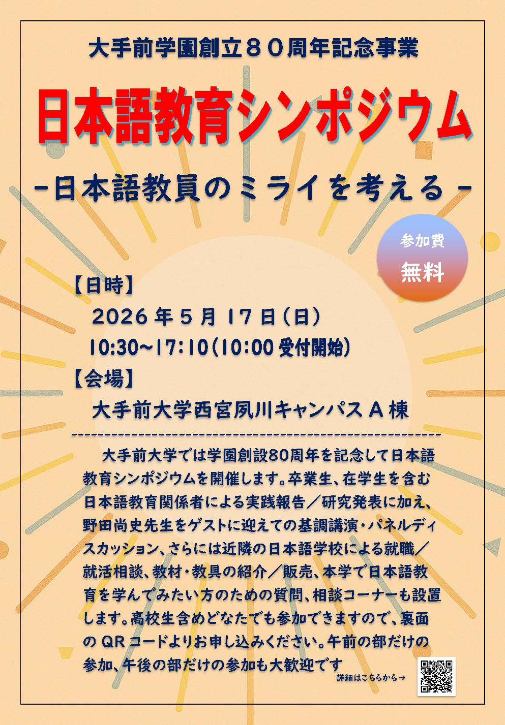 大手前大学では、5月17日(日)、西宮夙川キャンパスで大手前学園創立80周年を記念し、日本語教育シンポジウムを開催します。